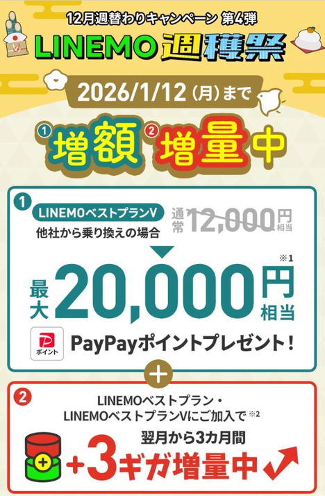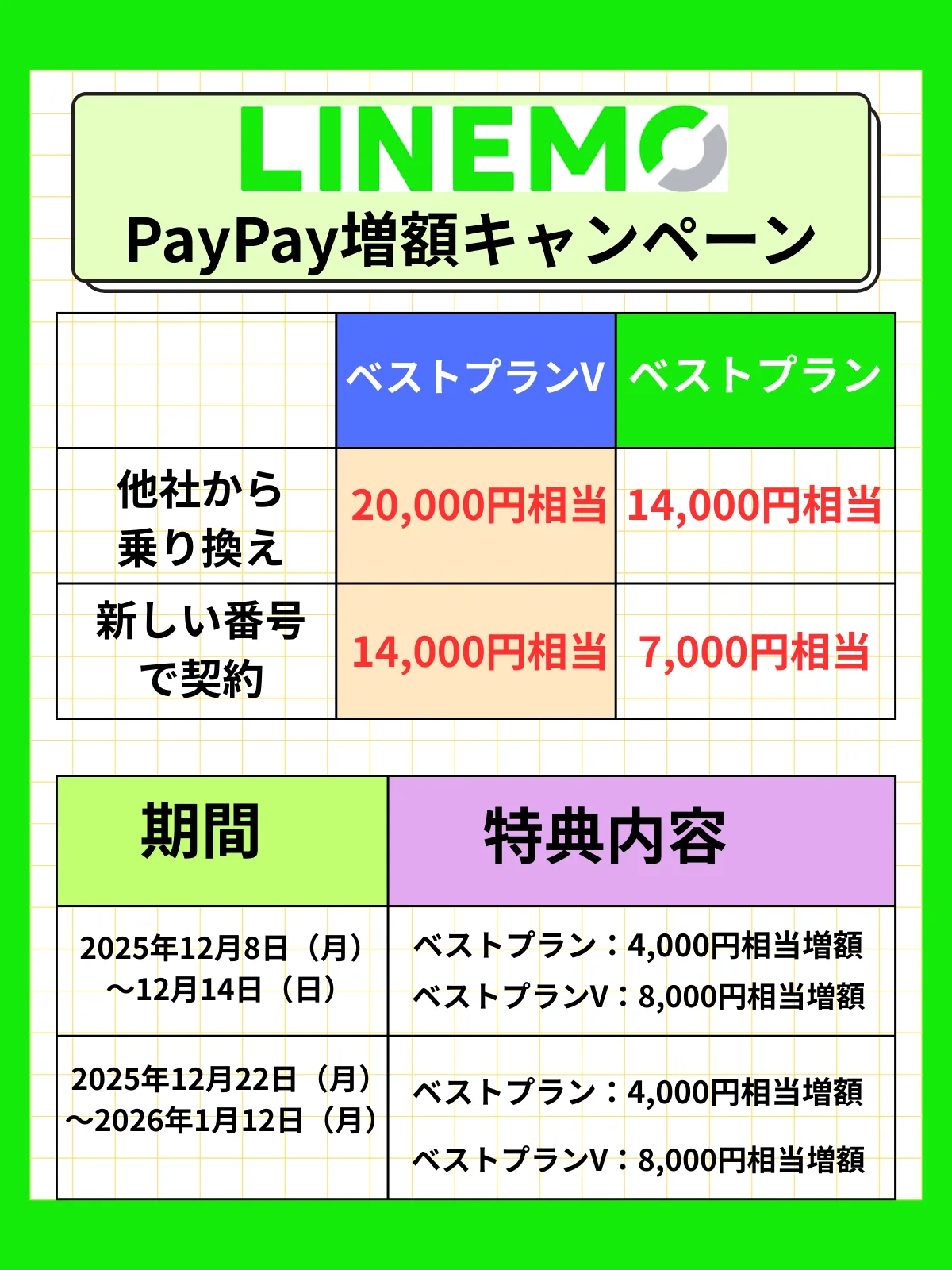 LINEMOベストプランVへ他社から乗り換えでPayPayポイント12,000円相当、新しい電話番号契約でPayPayポイント7,000円相当が貰えます。