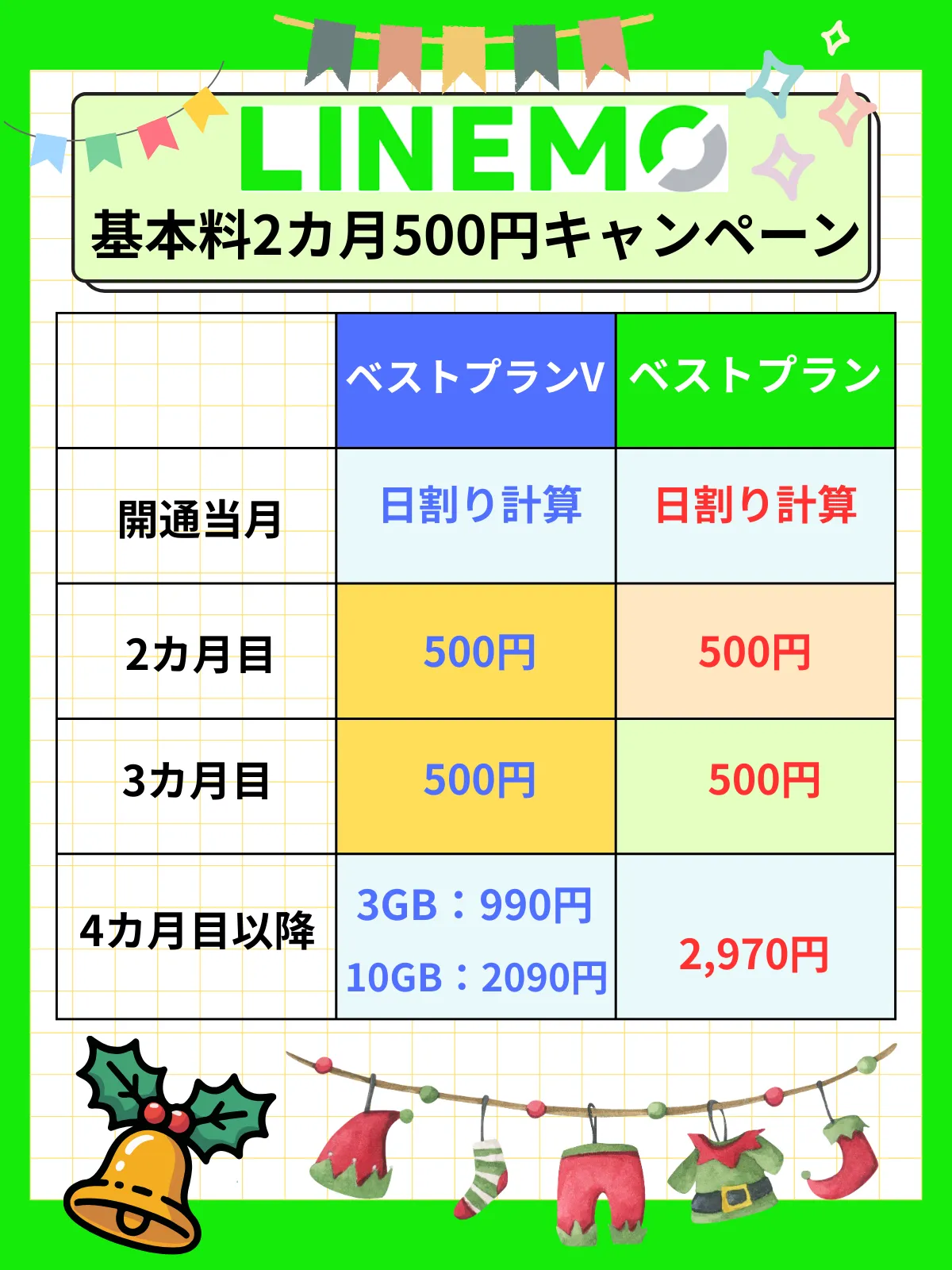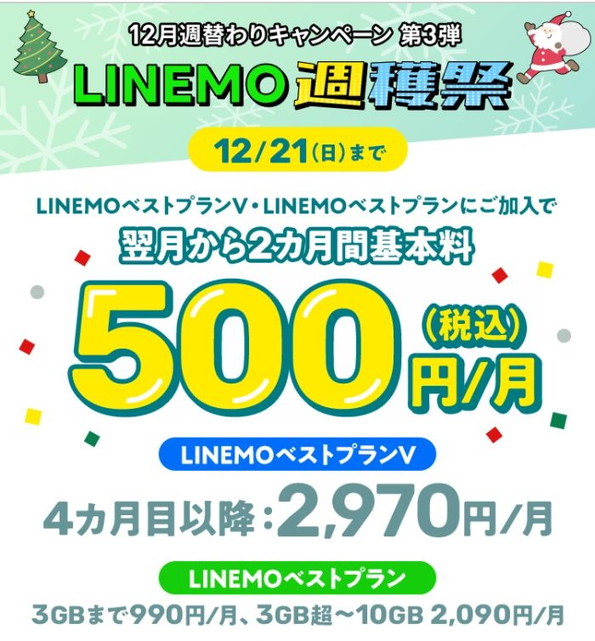 - 3.4 12月週替わりキャンペーン第3弾:LINEMO基本料2カ月 500円キャンペーン【2025年12月15日(月)〜12月21日(日)】