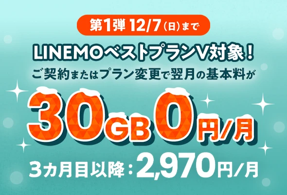 - 3.2 12月週替わりキャンペーン第1弾:LINEMOベストプランV基本料1カ月0円キャンペーン【2025年12月1日(月)〜12月7日(日)】