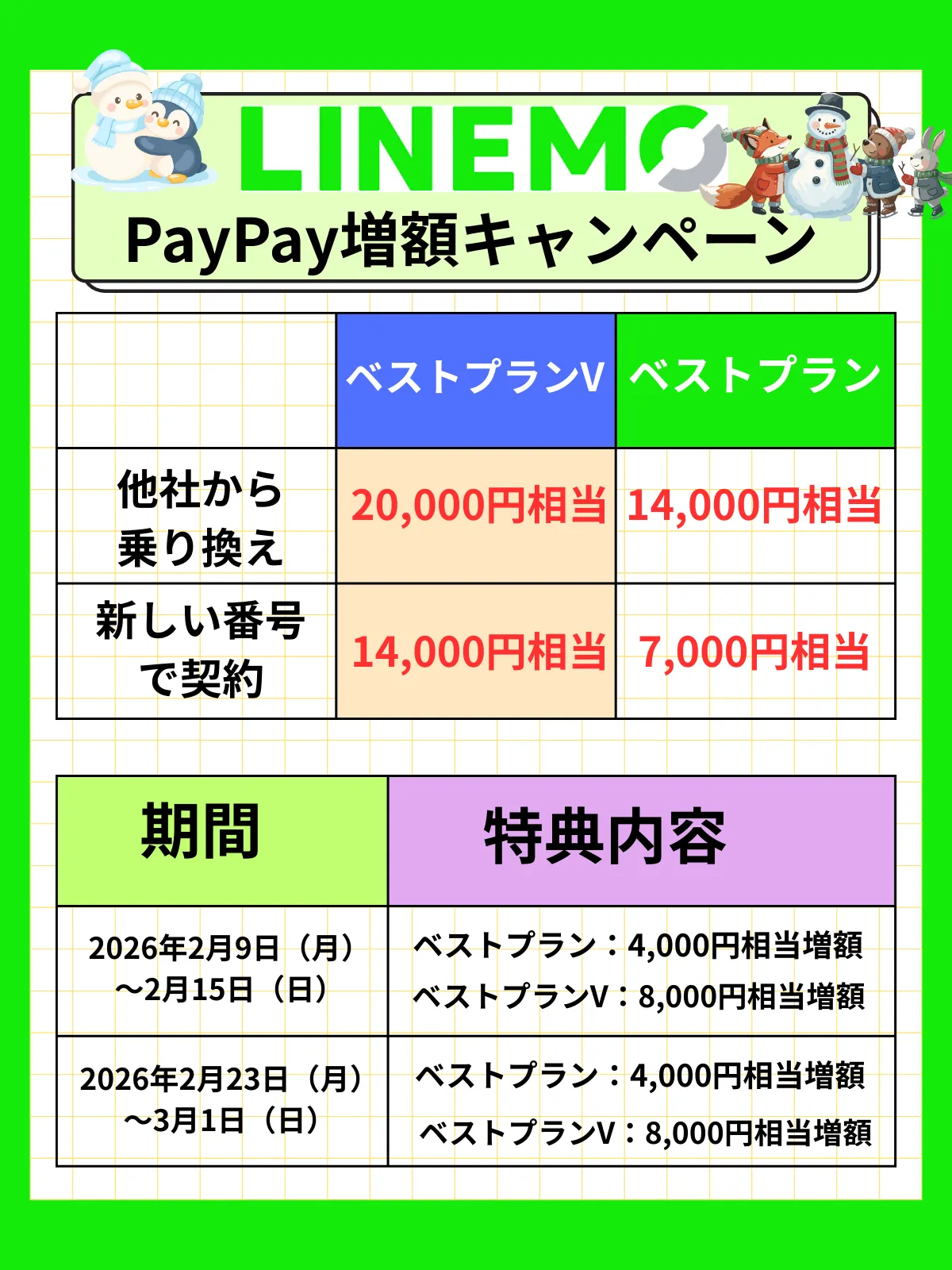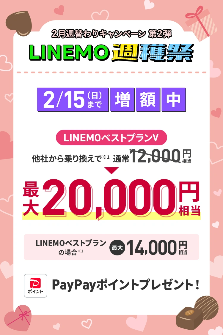 2026年2月9日(月)〜2月15日(日)までの期間中にLINEMOベストプランに新しい番号または他社からの乗り換えで契約でPayPayポイント4,000円相当が増額されます。