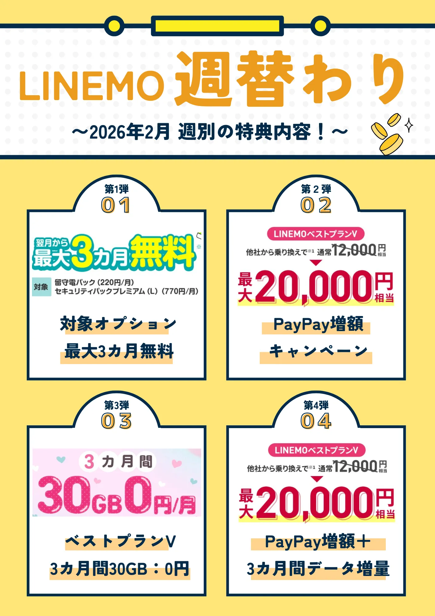- 3 【2026年2月】LINEMOキャンペーン週替わり特典|週別の特典内容
