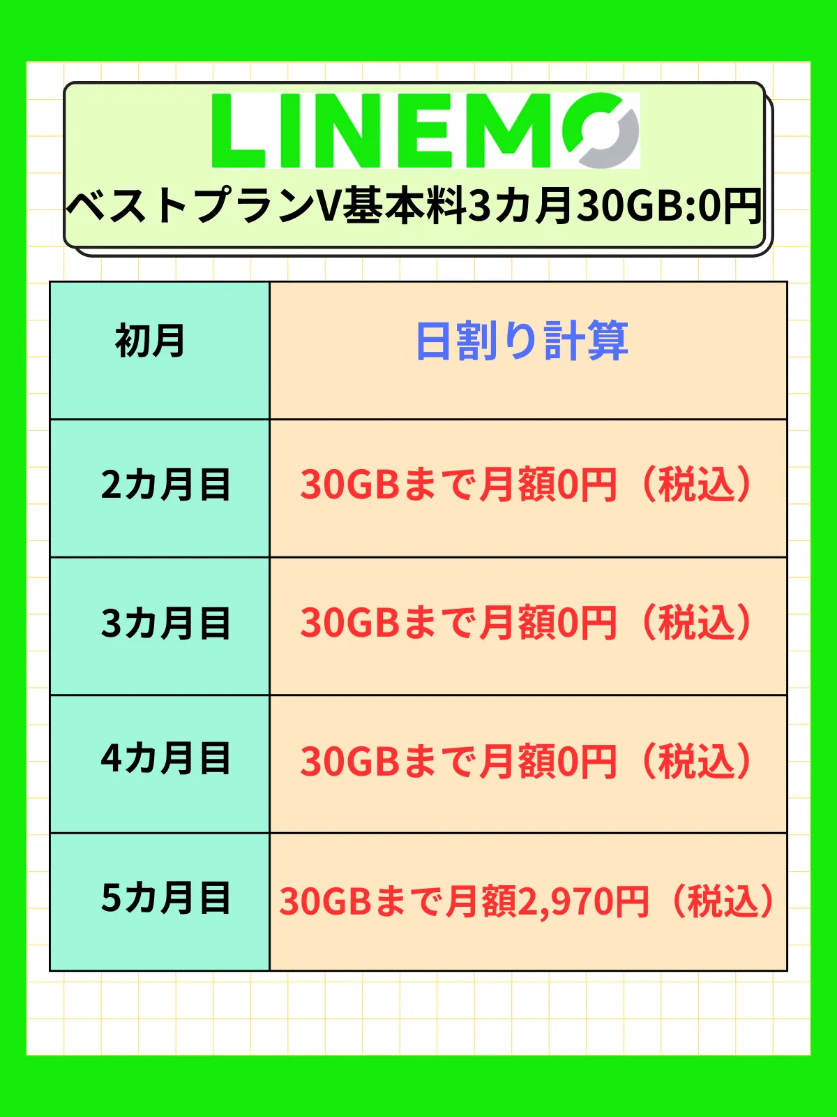 LINEMOベストプランVご契約で開通月の翌月から3カ月間基本料30GB:0円/月(税込) |