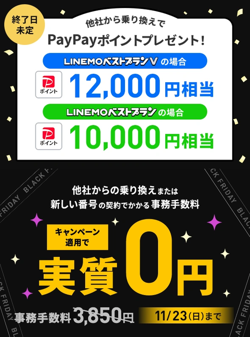 | 紹介された方の特典 | ■LINEMOベストプランV特典 他社からの乗り換えで PayPayポイント15,000円相当 ■LINEMOベストプラン特典 他社からの乗り換えで PayPayポイント5,940円相当 |